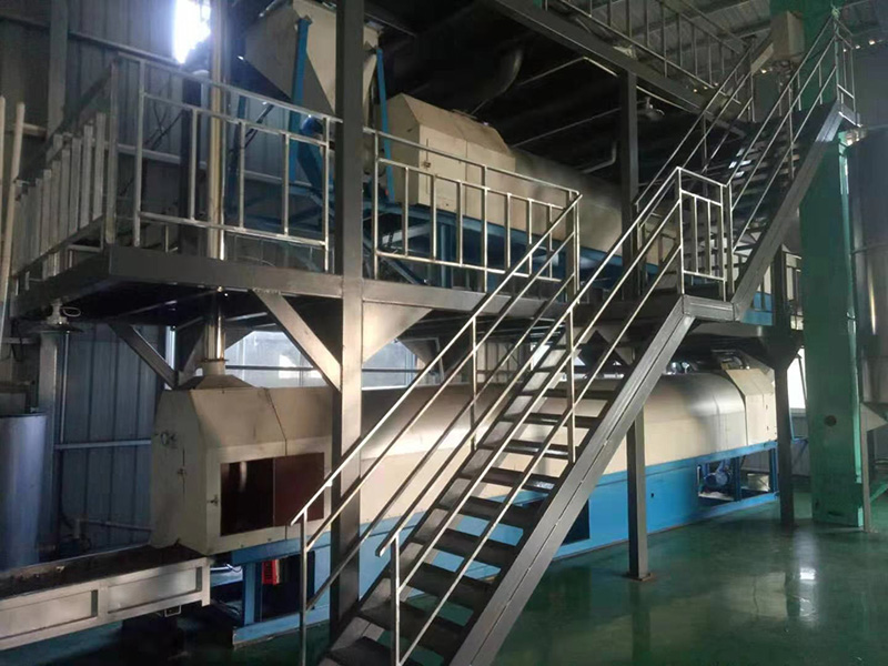 我們解決其技術問題所采用的技術方案是:一種新型環(huán)保節(jié)能熱風炒爐,由電源供電,包括第一燃燒室、第二燃燒室、熱風炒爐滾筒、存料機、自動喂料器、出料機、引風機和排潮風機,所述熱風炒爐滾筒的入口端通過自動喂料器與所述存料斗連通,所述熱風炒爐滾筒的入口端還通過風道與所述排潮風機連通,所述熱風炒爐滾筒的出口端與出料機連通,所述第一燃燒室和第二燃燒室通過風道與引風機連通,所述第一燃燒室和第二燃燒室分別位于所述熱風炒爐滾筒的下方,所述熱風炒爐滾筒軸心線與水平面形成2°到8°的夾角,所述第一燃燒器和第二燃燒器安裝位置在相應燃燒室的前端或者相應燃燒室的兩個側面。我們設備取消了原熱風炒爐所配套的單獨熱風爐、彎段風道或直段風道;在炒爐滾筒下方設計安裝兩份熱風燃燒室,用燃燒器產生的熱風直接對滾筒進行加熱,最大限度地縮減了炒爐散熱環(huán)節(jié)和面積,從而實現炒爐連段式加熱。與現有設備相比,我們公司設備充分利用了熱風釋放的熱量,減少了熱量損失,單噸油料或糧食加工消耗添人氣甚至能降低到25nm3,降低了17%,節(jié)能降耗效果非常明顯,得到了客戶的一致好評。與現有設備相比,同等日加工量,所配兩臺燃燒器合計功率比現有設備燃燒器功率下降20%-30%,熱風設定溫度有750-800℃下降到400-500℃,明顯延長了炒爐的使用壽命。第一燃燒室和第二燃燒室的功能各不相同,工作溫度也不一致,第一燃燒室和第二燃燒室能夠實現分段加熱溫度控制,更加靈活與合理,安全可靠,便于操作與控制。